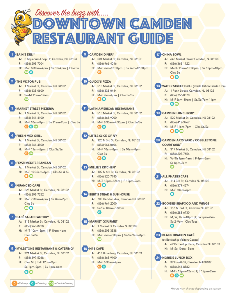 Looking for your next meal? Explore the interactive Downtown Camden Restaurant Guide to find restaurants, cafes, and other eateries. And check back regularly for promotions and exclusive offers.
