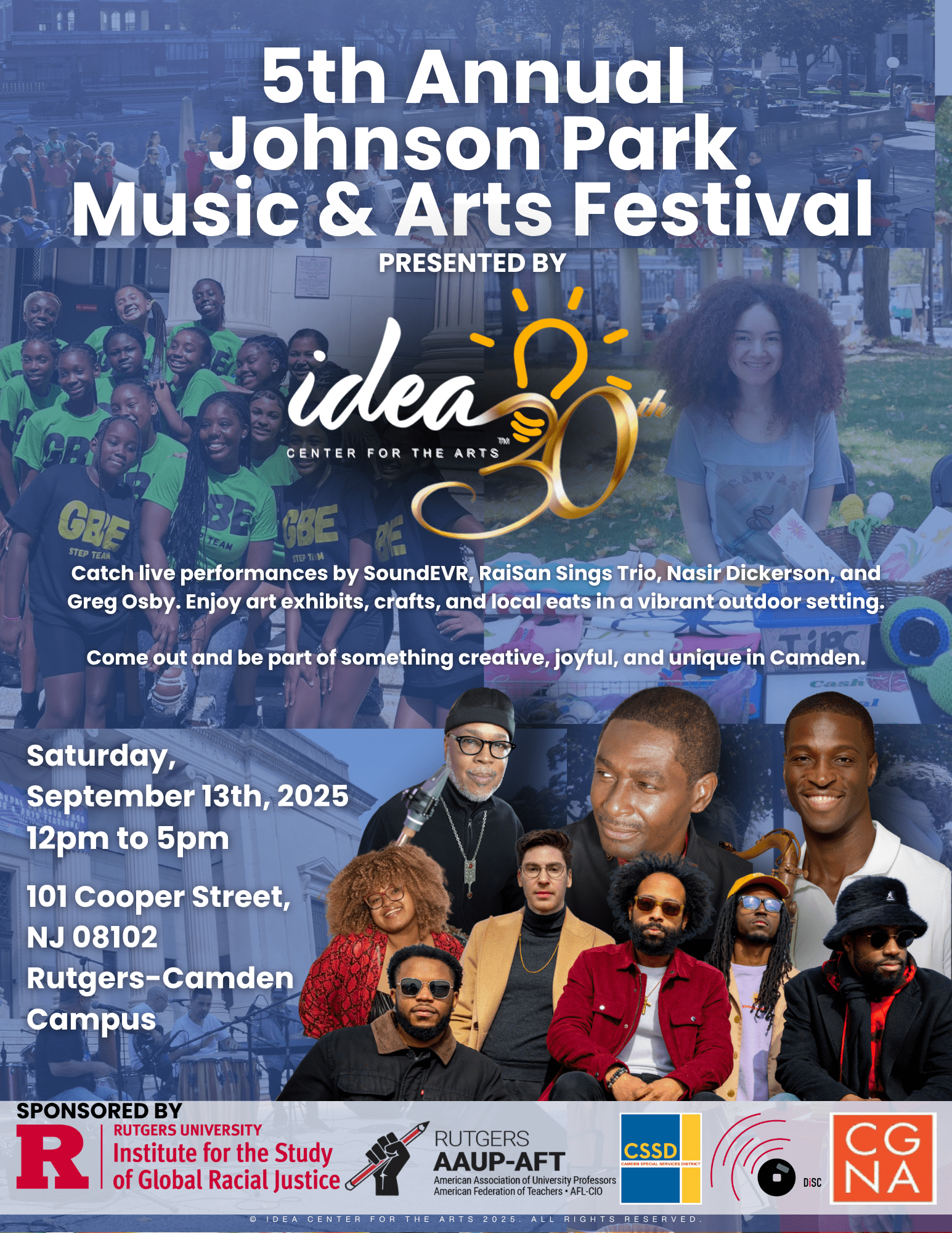 Now in its 30th year, IDEA Center for the Arts™ operates at the intersection of the arts and good health, building communities and contributing to the well being of Camden and South Jersey residents. IDEA’s free, quality arts’ and workforce development programs empower youth and children to live fulfilling lives. In that vein, the Johnson Park Music and Arts Festival was created by the IDEA Center for the Arts™ and the Rutgers-Camden Digital Studies Center Program in partnership with the Rutgers Institute for the Study of Global Racial Justice, Rutgers AAUP-AFT, Camden Special Services District, and the Cooper-Grant Neighborhood Association.