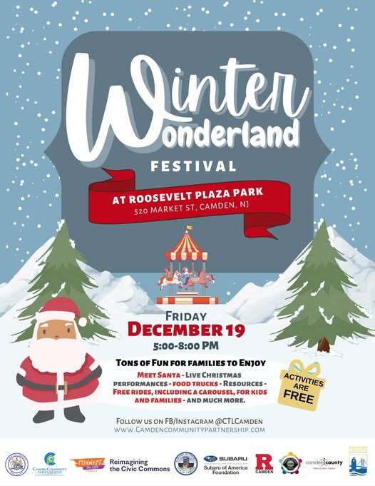 Join Camden Community Partnership for a magical evening at Roosevelt Plaza Park in Camden, NJ on Friday, December 19, 2025, from 5:00 PM to 8:00 PM for our annual Winter Wonderland celebration!