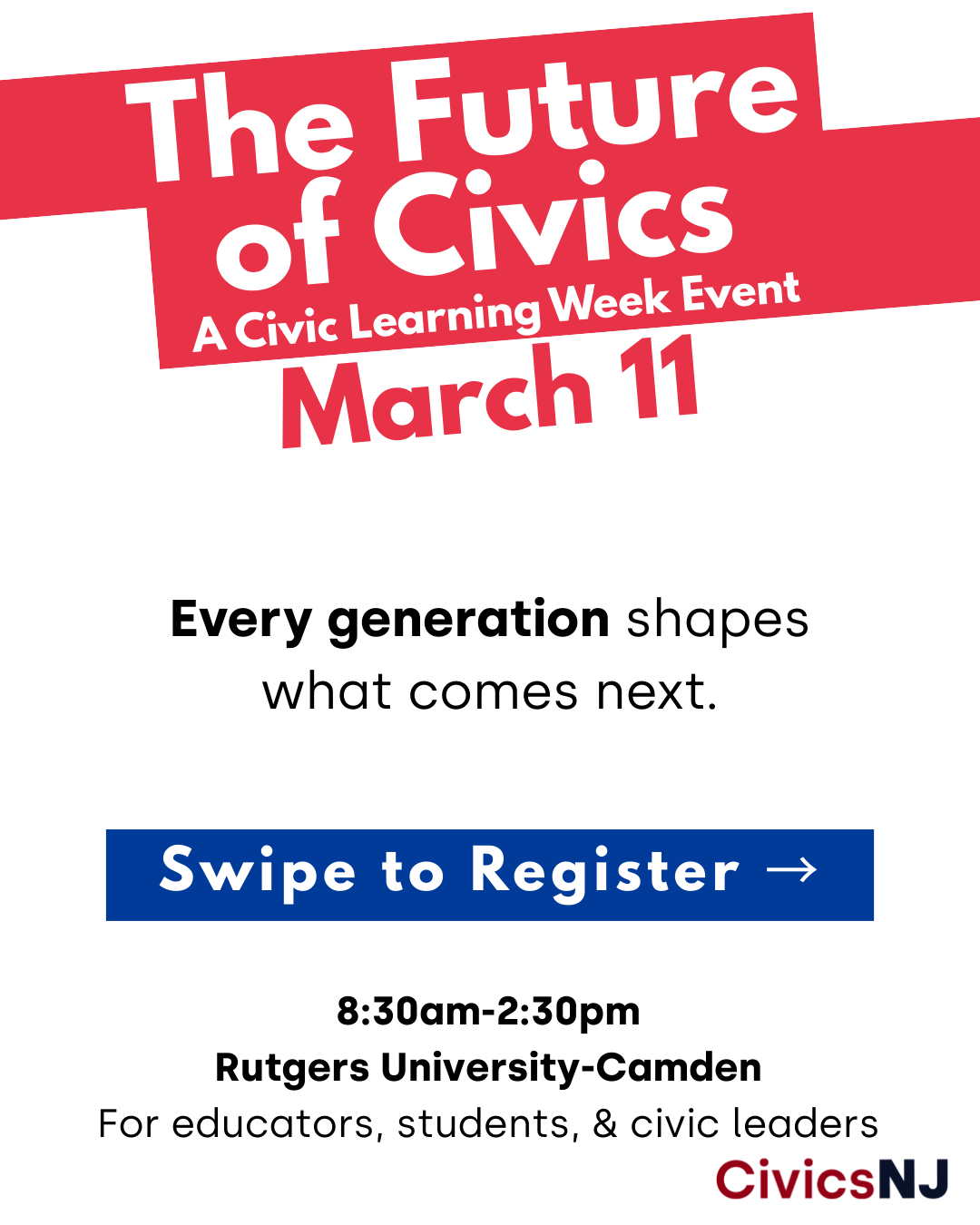 Every generation has a voice in what comes next. Be part of the conversation at The Future of Civics on March 11 at Rutgers University–Camden. This Civic Learning Week event brings together educators, students, and civic leaders to center youth voice in democracy.